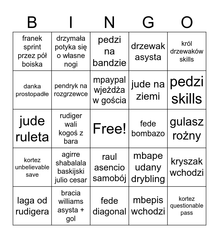 This bingo card has a free space and 24 words: agirre shabalala baskijski julio cesar, bracia williams asysta + gol, mpaypal wjeżdża w gościa, laga od rudigera, król drzewaków skills, franek sprint przez pół boiska, danka prostopadłe, drzymała potyka się o własne nogi, fede bombazo, raul asencio samobój, jude na ziemi, jude ruleta, mbape udany drybling, kryszak wchodzi, pendryk na rozgrzewce, mbepis wchodzi, gulasz rożny, pedzi na bandzie, pedzi skills, rudiger wali kogoś z bara, kortez questionable pass, kortez unbelievable save, drzewak asysta and fede diagonal.