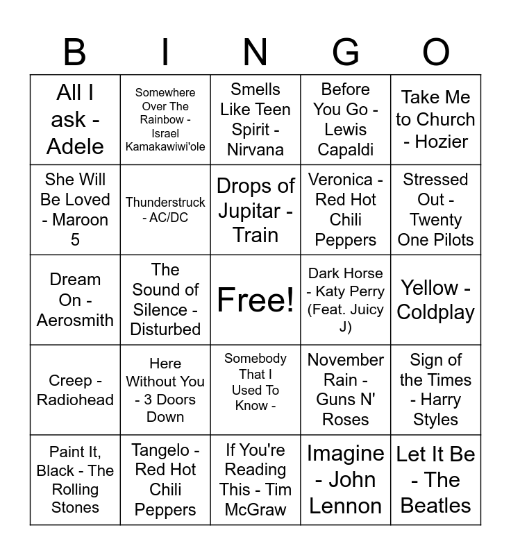 This bingo card has a free space and 24 words: Here Without You - 3 Doors Down, Tangelo - Red Hot Chili Peppers, Drops of Jupitar - Train, Paint It, Black - The Rolling Stones, Take Me to Church - Hozier, All I ask - Adele, She Will Be Loved - Maroon 5, Somewhere Over The Rainbow - Israel Kamakawiwi'ole, Dark Horse - Katy Perry (Feat. Juicy J), Somebody That I Used To Know -, Veronica - Red Hot Chili Peppers, Dream On - Aerosmith, November Rain - Guns N' Roses, Sign of the Times - Harry Styles, Thunderstruck - AC/DC, Imagine - John Lennon, Yellow - Coldplay, Smells Like Teen Spirit - Nirvana, Stressed Out - Twenty One Pilots, The Sound of Silence - Disturbed, Let It Be - The Beatles, Creep - Radiohead, Before You Go - Lewis Capaldi and If You're Reading This - Tim McGraw.
