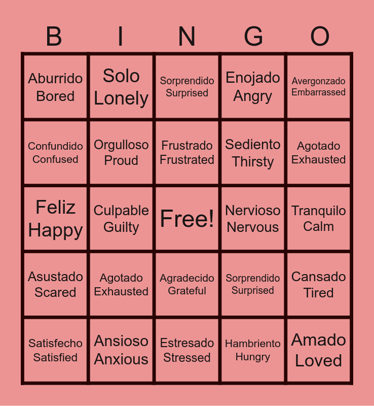 This bingo card has a free space and 34 words: Culpable Guilty, Hambriento Hungry, Contento Content, Esperanzado Hopeful, Asustado Scared, Orgulloso Proud, Avergonzado Embarrassed, Satisfecho Satisfied, Solo Lonely, Enamorado In love, Frustrado Frustrated, Sorprendido Surprised, Triste Sad, Satisfecho Satisfied, Nervioso Nervous, Agotado Exhausted, Ansioso Anxious, Feliz Happy, Agotado Exhausted, Sorprendido Surprised, Agradecido Grateful, Decepcionado Disappointed, Aburrido Bored, Tranquilo Calm, Estresado Stressed, Amado Loved, Enojado Angry, Celoso Jealous, Sediento Thirsty, Confundido Confused, Preocupado Worried, Culpable Guilty, Cansado Tired and Aliviado Relieved.