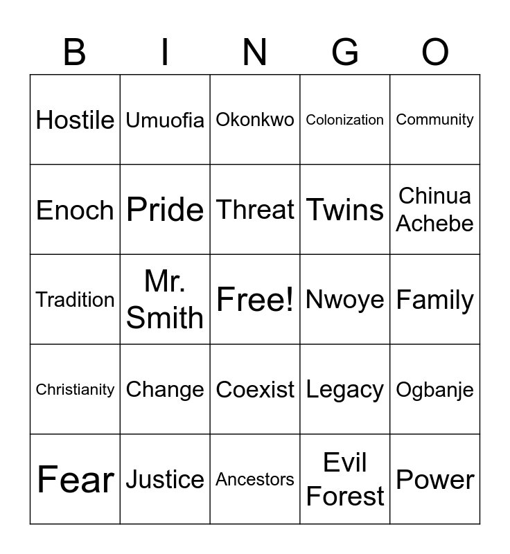 This bingo card has a free space and 28 words: Ogbanje, Egwugwu, Twins, Evil Forest, Enoch, Okonkwo, Umuofia, Christianity, Nwoye, Fear, Tradition, Colonization, Justice, Ancestors, Chinua Achebe, Culture, Change, Pride, Threat, Coexist, Hostile, Worship, Power, Mr. Smith, Family, Legacy, Community and Sacrifice.
