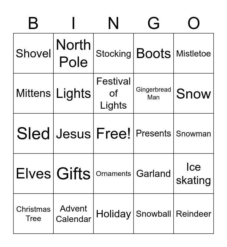 This bingo card has a free space and 29 words: Christmas Tree, Santa Claus, Jesus, Sleigh, Shovel, Stocking, Lights, Gifts, Presents, Advent Calendar, Snowman, Reindeer, Holiday, Snowball, Snow, Carols, Ornaments, Elves, Mistletoe, Sled, Garland, Icicles, Gingerbread Man, Mittens, Boots, North Pole, Ice skating, Festival of Lights and Jolly.