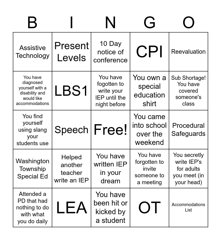 This bingo card has a free space and 32 words: OT, PT, Speech, Social Work, Washington Township Special Ed, LBS1, Reevaluation, You secretly write IEP's for adults you meet (in your head), Present Levels, Annual Review, You have fogotten to write your IEP until the night before, 10 Day notice of conference, Embrace, Goals and objectives, You came into school over the weekend, Gen. Ed kids have asked to come to your room, Attended a PD that had nothing to do with what you do daily, You find yourself using slang your students use, You have written IEP in your dream, Helped another teacher write an IEP, You have forgotten to invite someone to a meeting, A student has called you mom or dad, Procedural Safeguards, LEA, Accommodations List, CPI, You own a special education shirt, You have diagnosed yourself with a disability and would like accommodations, Assistive Technology, You have been hit or kicked by a student, FBA/BIP and Sub Shortage! You have covered someone's class.