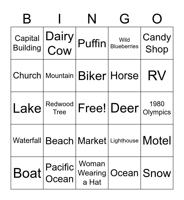 This bingo card has a free space and 24 words: Beach, Pacific Ocean, Biker, Boat, Candy Shop, Capital Building, Church, Dairy Cow, Deer, Market, Horse, Lake, Lighthouse, Motel, Mountain, Ocean, 1980 Olympics, Puffin, RV, Redwood Tree, Snow, Waterfall, Wild Blueberries and Woman Wearing a Hat.