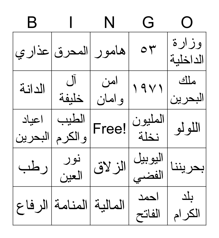 This bingo card has a free space and 24 words: نور العين, المنامة, امن وامان, الرفاع, وزارة الداخلية, عذاري, الدانة, المحرق, المليون نخلة, الزلاق, ١٩٧١, اعياد البحرين, اليوبيل الفضي, بحريننا, آل خليفة, احمد الفاتح, اللولو, هامور, ملك البحرين, الطيب والكرم, بلد الكرام, رطب, ٥٣ and المالية.