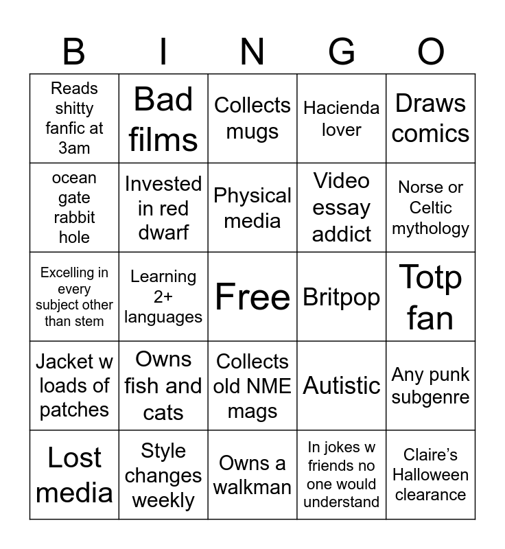 This bingo card has a free space and 24 words: Owns fish and cats, Style changes weekly, Physical media, Lost media, Draws comics, Reads shitty fanfic at 3am, ocean gate rabbit hole, Bad films, Britpop, Collects old NME mags, Video essay addict, Excelling in every subject other than stem, Autistic, Any punk subgenre, Invested in red dwarf, In jokes w friends no one would understand, Totp fan, Collects mugs, Norse or Celtic mythology, Learning 2+ languages, Claire’s Halloween clearance, Jacket w loads of patches, Hacienda lover and Owns a walkman.