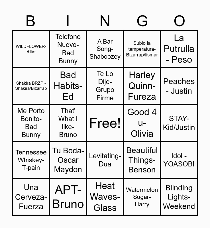 This bingo card has a free space and 30 words: APT- Bruno, Espresso- Sabrina, That' What I like- Bruno, Good Luck, Babe- Chappell, WILDFLOWER- Billie, A Bar Song- Shaboozey, Bad Habits- Ed, Levitating- Dua, Good 4 u- Olivia, Heat Waves- Glass, STAY- Kid/Justin, Blinding Lights- Weekend, Watermelon Sugar- Harry, I Don't Want to Wait - One Republic, Peaches - Justin, Please Please Please- Sabrina, Beautiful Things- Benson, Tennessee Whiskey- T-pain, Tu Boda- Oscar Maydon, La Putrulla - Peso, Me Porto Bonito- Bad Bunny, Monaco- Bad Bunny, Telefono Nuevo- Bad Bunny, Harley Quinn- Fureza, Shakira BRZP - Shakira/Bizarrap, Subio la temperatura- Bizarrap/lismar, Idol - YOASOBI, Una Cerveza- Fuerza, Te Lo Dije- Grupo Firme and Lady Gaga - Peso.