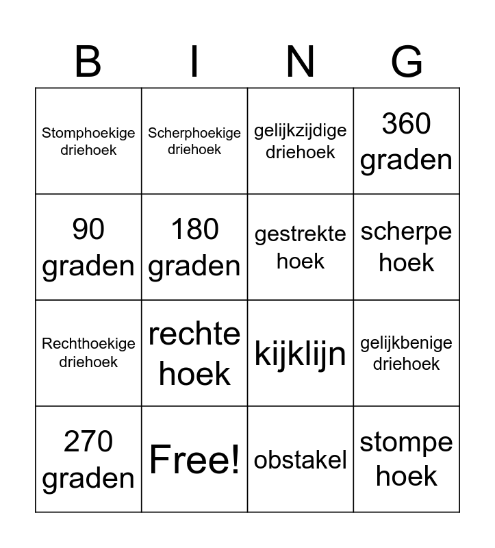 This bingo card has 16 words: Free!, gelijkbenige driehoek, gelijkzijdige driehoek, Stomphoekige driehoek, Rechthoekige driehoek, Scherphoekige driehoek, kijklijn, obstakel, 90 graden, 180 graden, 270 graden, 360 graden, rechte hoek, scherpe hoek, gestrekte hoek and stompe hoek.