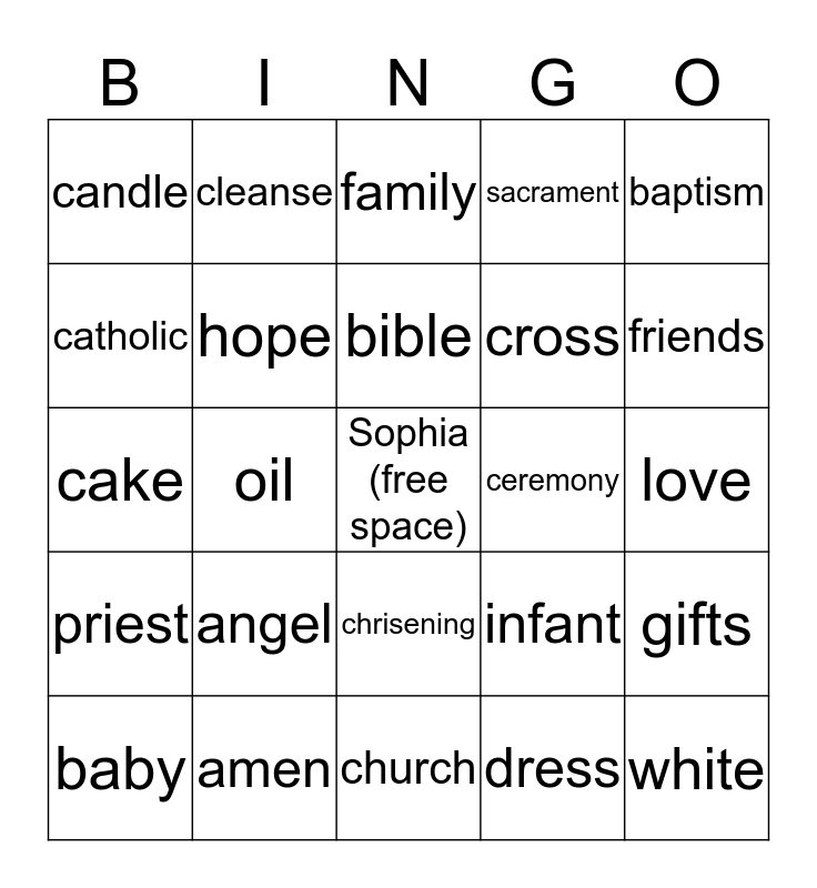 This bingo card has a free space and 24 words: angel, amen, bible, baby, baptism, candle, catholic, cleanse, ceremony, chrisening, cross, cake, infant, gifts, hope, dress, love, family, friends, oil, white, priest, sacrament and church.