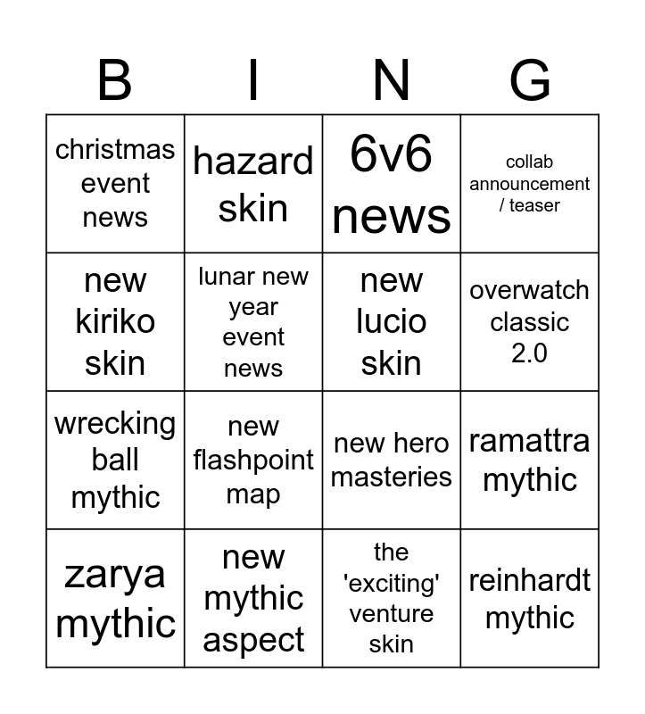 This bingo card has 16 words: new mythic aspect, ramattra mythic, 6v6 news, christmas event news, wrecking ball mythic, hazard skin, new hero masteries, the 'exciting' venture skin, new kiriko skin, lunar new year event news, zarya mythic, collab announcement / teaser, new flashpoint map, overwatch classic 2.0, new lucio skin and reinhardt mythic.