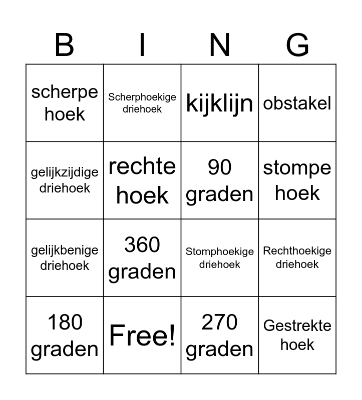 This bingo card has 16 words: Free!, Rechthoekige driehoek, kijklijn, scherpe hoek, gelijkbenige driehoek, Scherphoekige driehoek, Stomphoekige driehoek, 270 graden, gelijkzijdige driehoek, rechte hoek, 180 graden, obstakel, 360 graden, stompe hoek, 90 graden and Gestrekte hoek.