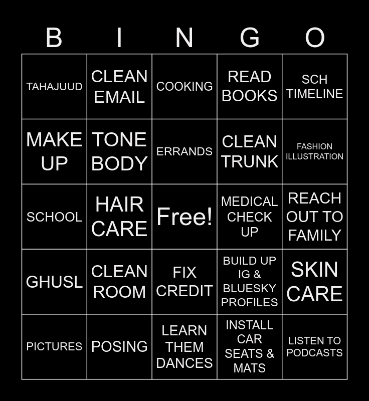 This bingo card has a free space and 24 words: CLEAN ROOM, POSING, ERRANDS, PICTURES, SCH TIMELINE, TAHAJUUD, MAKE UP, CLEAN EMAIL, MEDICAL CHECK UP, FIX CREDIT, CLEAN TRUNK, SCHOOL, BUILD UP IG & BLUESKY PROFILES, SKIN CARE, TONE BODY, INSTALL CAR SEATS & MATS, REACH OUT TO FAMILY, COOKING, FASHION ILLUSTRATION, HAIR CARE, LISTEN TO PODCASTS, GHUSL, READ BOOKS and LEARN THEM DANCES.