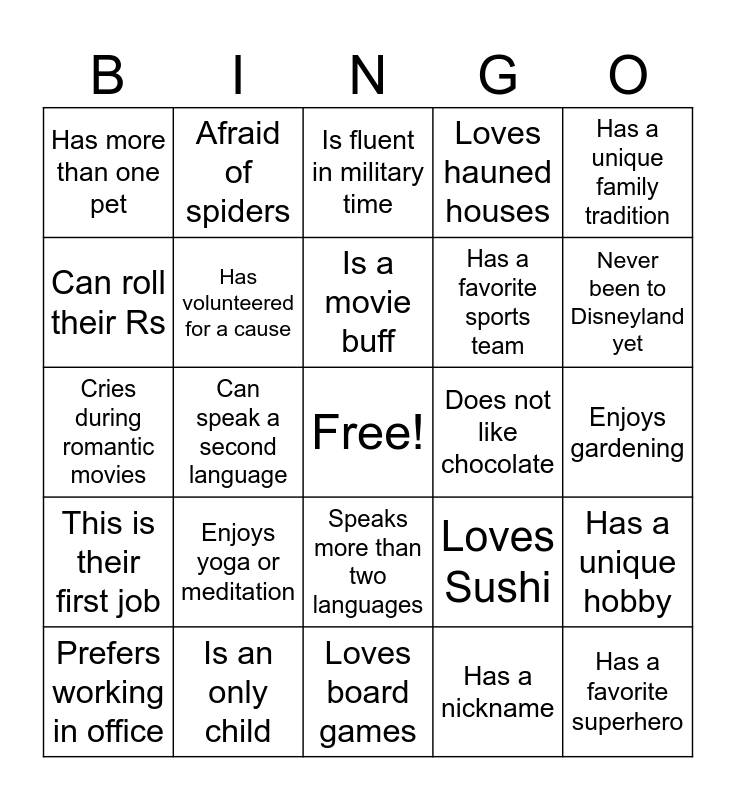 This bingo card has a free space and 89 words: Has traveled to more than 5 countries, Plays a musical instrument, Speaks more than two languages, Has a pet, Loves hiking, Is a coffee enthusiast, Enjoys cooking or baking, Has run a marathon, Is a night owl, Prefers tea over coffee, Has met a celebrity, Is a morning person, Has a unique hobby, Enjoys gardening, Has lived in another country, Is a movie buff, Loves to dance, Is a sports fan, Has a hidden talent, Enjoys painting or drawing, Has been skydiving, Is a foodie, Loves board games, Has a favorite podcast, Cries during romantic movies, Is an only child, Has a guilty pleasure movie book TVshow Mag, Lived outside current work state, Has non-canine/feline pets, Plays video games daily, Loves hauned houses, Can speak a second language, Can change tires & oil in car, Has more than one pet, Loves to travel, Is fluent in military time, Can roll their Rs, Never been on a plan yet, Never been to Disneyland yet, Prefers working in office, This is their first job, Loves reading books, Is left handed, Has more than a 1hr commute, Loves Sushi, Does not like chocolate, Plays the piano, Can sew or crochet, Favorite color is green, Afraid of spiders, Has been in Military, Cannot ride a bicycle, Avid jogger, Plays sports, Can draw, Rides bus to work, Has a pet fish, Has more than 3 siblings, IOS all the way, Android or no way, Does not like breakfast, Has a non-tech degree, Knows 2024 is year of Chicken Coop, Born outside work country, Has a twin or is a twin, Has worked in more than three industries, Is a fan of a specific TV series, Has a collection (e.g., stamps, coins, etc.), Has been on a road trip, Enjoys yoga or meditation, Has a favorite superhero, Has attended a concert recently, Is a plant parent, Has a favorite sports team, Has volunteered for a cause, Has a nickname, Is an only child, Has a favorite holiday destination, Enjoys puzzles or brainteasers, Has a favorite childhood memory, Has a unique family tradition, Is a tech enthusiast, Has a favorite cuisine, Has a fear of heights, Is a fan of spicy food, Has a favorite quote or saying, Has a favorite season, Has a favorite animal and Has a bucket list item they’ve completed.