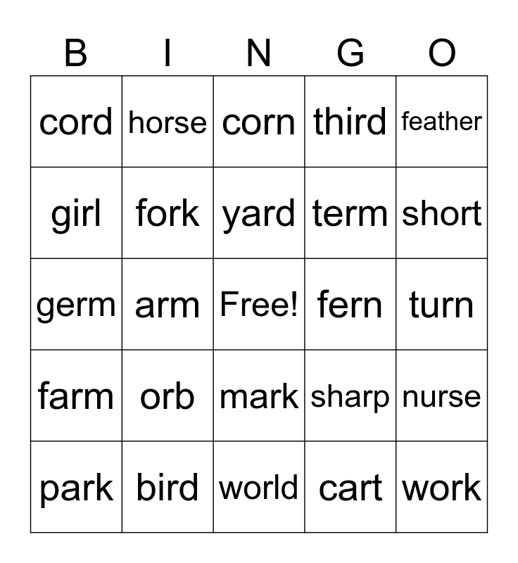 This bingo card has a free space and 29 words: park, far, arm, barn, cord, corn, fork, orb, fern, bird, turn, work, world, cart, short, herd, mark, farm, feather, germ, sharp, part, term, girl, third, horse, nurse, yard and yarn.