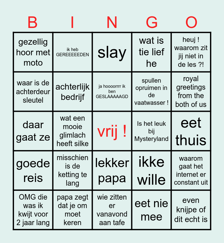 This bingo card has a free space and 24 words: misschien is de ketting te lang, papa zegt dat je om moet keren, ja hoooorrrr ik ben GESLAAAAAGD, OMG die was ik kwijt voor 2 jaar lang, heuj ! waarom zit jij niet in de les ?!, gezellig hoor met moto, waar is de achterdeur sleutel, ik heb GEREEEEEDEN, Is het leuk bij Mysteryland, lekker papa, spullen opruimen in de vaatwasser !, daar gaat ze, ikke wille, waarom gaat het internet er constant uit, achterlijk bedrijf, eet nie mee, eet thuis, slay, royal greetings from the both of us, wat een mooie glimlach heeft silke, even knijpe of dit echt is, goede reis, wat is tie lief he and wie zitten er vanavond aan tafe.