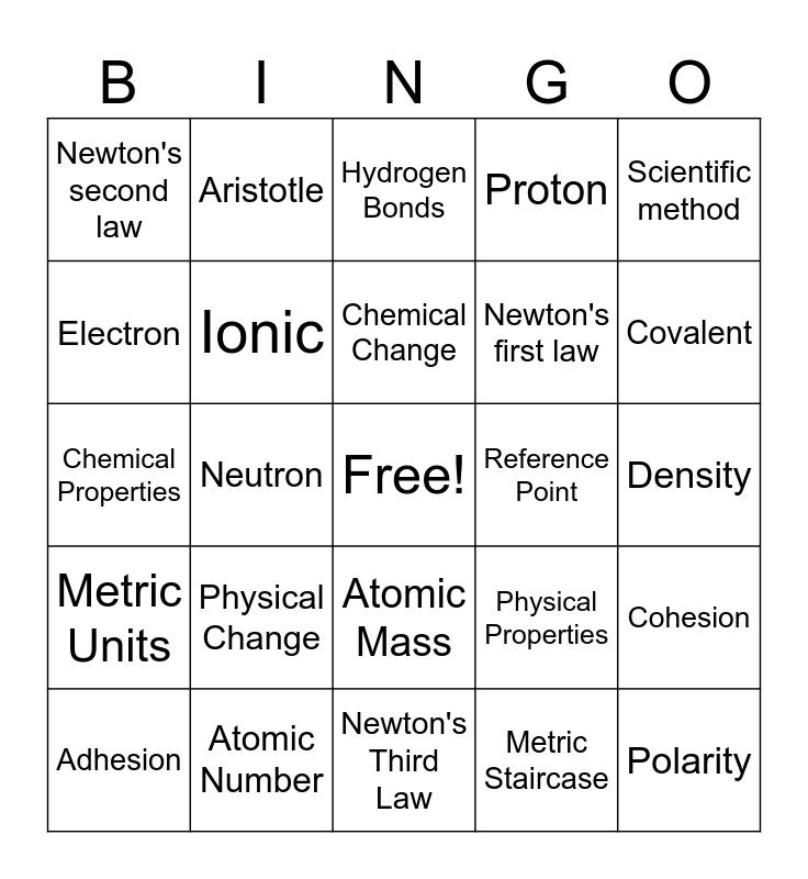 This bingo card has a free space and 24 words: Physical Change, Atomic Number, Chemical Change, Adhesion, Scientific method, Newton's second law, Electron, Aristotle, Reference Point, Atomic Mass, Newton's first law, Chemical Properties, Physical Properties, Cohesion, Ionic, Metric Staircase, Density, Hydrogen Bonds, Covalent, Neutron, Polarity, Metric Units, Proton and Newton's Third Law.