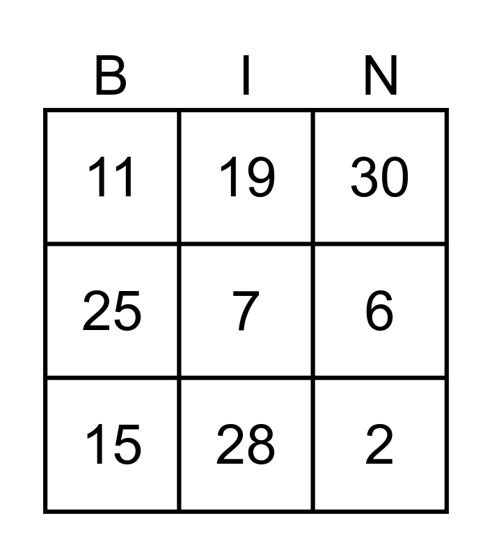 This bingo card has a free space and 8 words: 6, 30, 19, 15, 11, 2, 25 and 28.