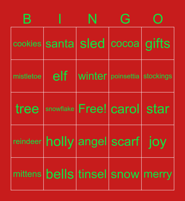 This bingo card has a free space and 24 words: holly, bells, winter, mittens, gifts, cookies, mistletoe, santa, carol, angel, poinsettia, tree, scarf, joy, elf, snow, star, sled, stockings, snowflake, merry, reindeer, cocoa and tinsel.