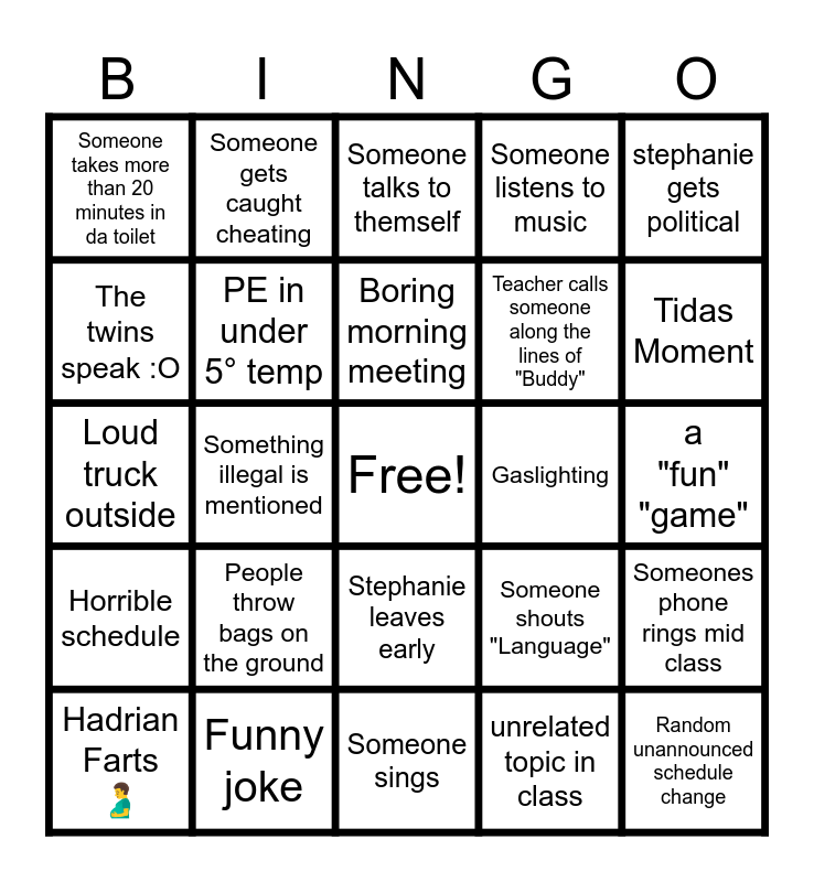 This bingo card has a free space and 27 words: Someone shouts "Language", Reece moment, Teacher calls someone along the lines of "Buddy", Someone sings, The twins speak :O, Someone talks to themself, Someone gets caught cheating, Horrible schedule, Gaslighting, Someones phone rings mid class, Loud truck outside, Someone listens to music, Hadrian Farts 🫃, Funny joke, Tidas Moment, Meme mentioned (DNF IF REMY), PE in under 5° temp, Boring morning meeting, People throw bags on the ground, Someone takes more than 20 minutes in da toilet, a "fun" "game", unrelated topic in class, Something illegal is mentioned, Random unannounced schedule change, Stephanie leaves early, stephanie gets political and ben walks in and screams at everyone.