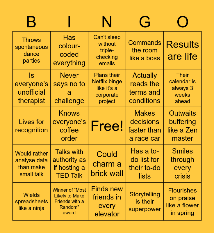 This bingo card has a free space and 24 words: Talks with authority as if hosting a TED Talk, Winner of “Most Likely to Make Friends with a Random” award, Plans their Netflix binge like it’s a corporate project, Wields spreadsheets like a ninja, Results are life, Throws spontaneous dance parties, Is everyone's unofficial therapist, Has colour-coded everything, Makes decisions faster than a race car, Could charm a brick wall, Actually reads the terms and conditions, Lives for recognition, Has a to-do list for their to-do lists, Smiles through every crisis, Never says no to a challenge, Storytelling is their superpower, Outwaits buffering like a Zen master, Can't sleep without triple-checking emails, Their calendar is always 3 weeks ahead, Knows everyone's coffee order, Flourishes on praise like a flower in spring, Would rather analyse data than make small talk, Commands the room like a boss and Finds new friends in every elevator.