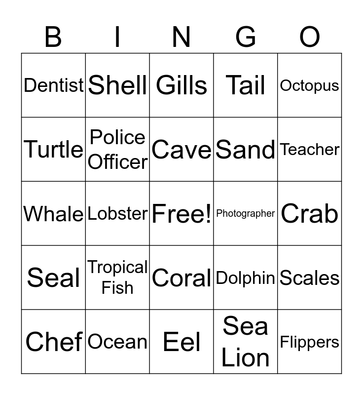 This bingo card has a free space and 24 words: Tropical Fish, Ocean, Cave, Chef, Octopus, Dentist, Turtle, Shell, Photographer, Coral, Sand, Whale, Dolphin, Scales, Police Officer, Sea Lion, Crab, Gills, Teacher, Lobster, Flippers, Seal, Tail and Eel.