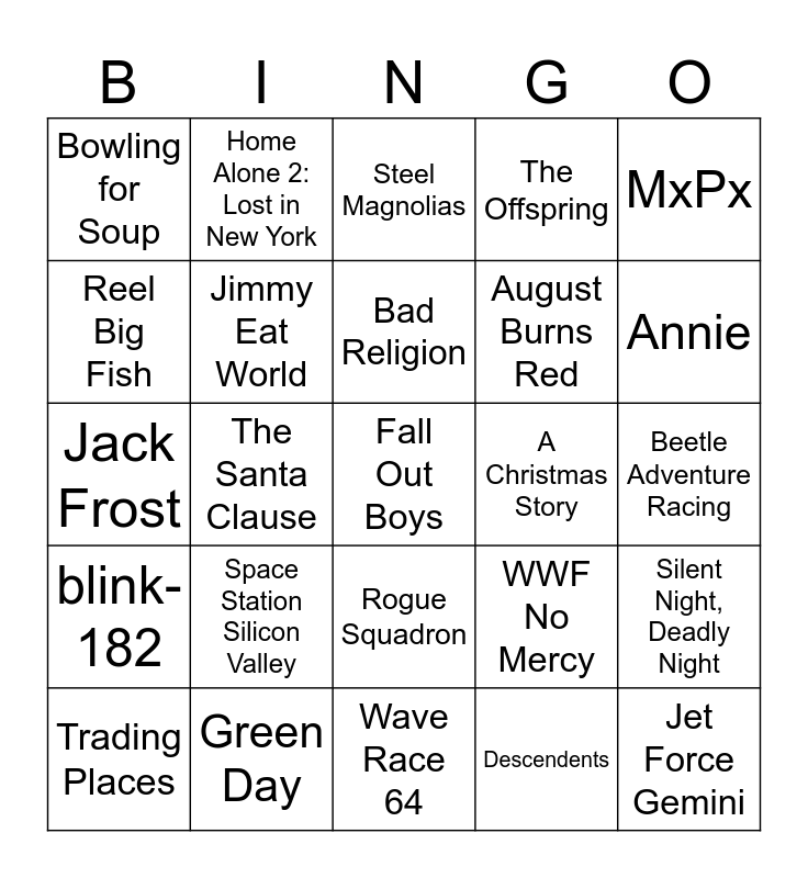 This bingo card has 60 words: My Chemical Romance, Green Day, A Day to Remember, blink-182, Descendents, No Doubt, Jimmy Eat World, Fountains of Wayne, August Burns Red, Something Corporate, The Offspring, Weezer, Reel Big Fish, Simple Plan, The Linda Lindas, Bowling for Soup, Fall Out Boys, MxPx, The Mighty Mighty Bosstones, Bad Religion, A Christmas Story, Steel Magnolias, Trading Places, Silent Night, Deadly Night, National Lampoon’s Christmas Vacation, When Harry Met Sally, Scrooged, Die Hard, Annie, Babes in Toyland, Ernest Saves Christmas, Muppet’s Christmas Carol, The Nightmare Before Christmas, Home Alone, Home Alone 2: Lost in New York, Batman Returns, Jingle All the Way, The Santa Clause, Jack Frost, Jack Frost, Blast Corps, Space Station Silicon Valley, Beetle Adventure Racing, 1080 Snowboarding, WWF No Mercy, Diddy Kong Racing, F-Zero X, GoldenEye 007, Mario Party, Rogue Squadron, Wave Race 64, Super Smash Bros, Perfect Dark, Banjo-Kazooie, Legend of Zelda: Majora’s Mask, Legend of Zelda: Ocarina of Time, Super Mario 64, Starcraft 64, Jet Force Gemini and Turok 2: Seeds of Evil.