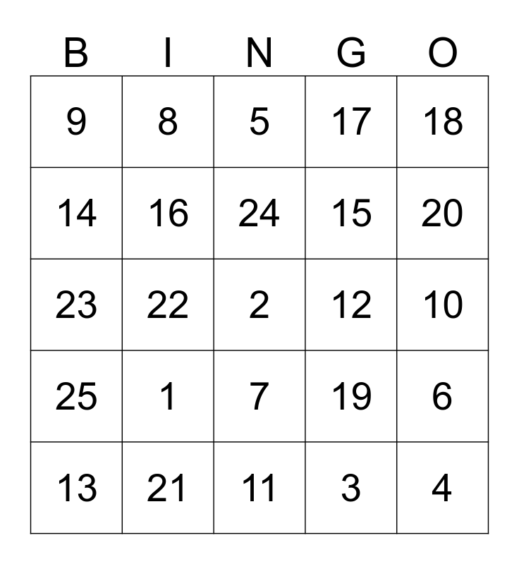 This bingo card has a free space and 24 words: 1, 21, 24, 13, 18, 9, 14, 8, 12, 7, 15, 23, 19, 6, 16, 3, 10, 5, 20, 22, 4, 25, 17 and 11.