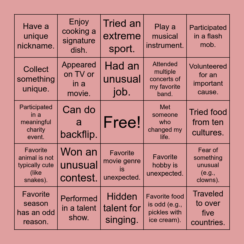 This bingo card has a free space and 50 words: Met a celebrity unexpectedly., Traveled to over five countries., Speak three or more languages., Hidden talent for singing., Won an unusual contest., Own a pet that’s not a dog or cat., Enjoy cooking a signature dish., Ran a marathon., Collect something unique., Went skydiving or bungee jumping., Appeared on TV or in a movie., Play a musical instrument., Fear of something unusual (e.g., clowns)., Favorite hobby is unexpected., Lived in three or more places., Related to someone famous., Had an unusual job., Met someone who changed my life., Read over 50 books last year., Participated in a flash mob., Can do a backflip., Favorite food is odd (e.g., pickles with ice cream)., Have a unique nickname., Attended multiple concerts of my favorite band., Have an unusual fear., First job was unexpected., Volunteered for an important cause., Took a spontaneous trip., Tried an extreme sport., Favorite movie genre is unexpected., Embarrassing moment turned funny story., Can recite the alphabet backward., Favorite childhood toy was unusual., Had dinner with someone famous (sort of)., Performed in a talent show., Family has a quirky tradition., Can name all U.S. presidents in order., Mistaken for someone else before., Dream vacation is adventurous., Tried food from ten cultures., Good at trivia games!, Artwork displayed publicly (even locally)., Afraid of the dark but love horror movies!, Went on a spontaneous road trip., Favorite season has an odd reason., Participated in a meaningful charity event., Guilty pleasure TV show is unexpected., Learned something new as an adult (like surfing)., Favorite animal is not typically cute (like snakes). and Experienced something supernatural..
