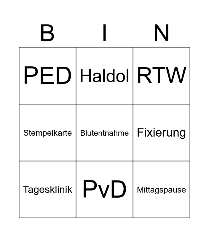 This bingo card has 35 words: PACS, K-Station, S-Station, Tagesklinik, Ambulanz, Stempelkarte, Fixierung, AvD, PvD, Schichtdienst, Vitalzeichen, Blutentnahme, Hr. Dr. med. Hapfelmeier, Therapeuten, PED, Therapie, Ergo, Moto, Musik, Tiere, Schlüssel, Alarmknopf, Ausgang, Polizeieinsatz, RTW, Skills, TimeOut, Sozialarbeiter, Mittagspause, BEP, TU, Postrunde, Pipamperon, Haldol and Elvanse.
