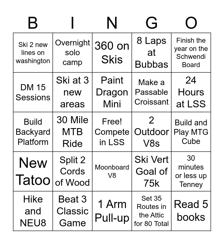 This bingo card has a free space and 24 words: Split 2 Cords of Wood, Beat 3 Classic Game, Paint Dragon Mini, Hike and NEU8, Finish the year on the Schwendi Board, Ski 2 new lines on washington, DM 15 Sessions, Overnight solo camp, 2 Outdoor V8s, Moonboard V8, Make a Passable Croissant, Build Backyard Platform, Ski Vert Goal of 75k, 30 minutes or less up Tenney, Ski at 3 new areas, Set 35 Routes in the Attic for 80 Total, Build and Play MTG Cube, 360 on Skis, 24 Hours at LSS, 30 Mile MTB Ride, Read 5 books, New Tatoo, 8 Laps at Bubbas and 1 Arm Pull-up.