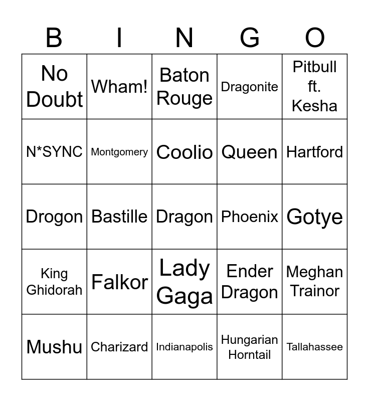 This bingo card has 65 words: Radiohead, The White Stripes, Britney Spears, Meghan Trainor, Tears for Fears, blink-182, Wham!, Macklemore, Coolio, Chappel Roan, Lady Gaga, Lorde, Gotye, Pitbull ft. Kesha, Outkast, N*SYNC, Bastille, No Doubt, Soundgarden, Queen, Falkor, King Ghidorah, Dragonite, Elliot (Pete’s Dragon), Smaug, Haku, Devon & Cornwall, Discord, Dragon, Maleficent, Mushu, Sisu, Toothless, Trogdor, Ender Dragon, Charizard, Spyro, Drogon, Hungarian Horntail, Lockheed, Montgomery, Juneau, Phoenix, Little Rock, Sacramento, Denver, Hartford, Dover, Tallahassee, Atlanta, Honolulu, Boise, Springfield, Indianapolis, Des Moines, Topeka, Frankfort, Baton Rouge, Augusta, Annapolis, Boston, Lansing, Saint Paul, Jackson and Jefferson City.