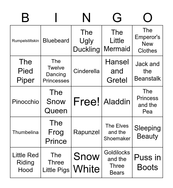 This bingo card has a free space and 25 words: The Frog Prince, Snow White, Cinderella, Little Red Riding Hood, The Emperor's New Clothes, Rumpelstiltskin, The Pied Piper, Bluebeard, Aladdin, Rapunzel, Hansel and Gretel, Pinocchio, The Elves and the Shoemaker, Sleeping Beauty, The Twelve Dancing Princesses, Beauty and the Beast, The Princess and the Pea, The Ugly Duckling, Jack and the Beanstalk, The Snow Queen, Puss in Boots, The Three Little Pigs, Thumbelina, The Little Mermaid and Goldilocks and the Three Bears.