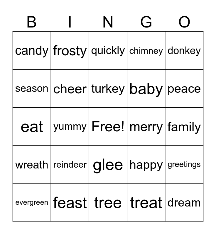 This bingo card has a free space and 24 words: reindeer, feast, turkey, evergreen, donkey, candy, season, frosty, merry, glee, baby, eat, happy, greetings, cheer, treat, family, quickly, peace, yummy, dream, wreath, chimney and tree.