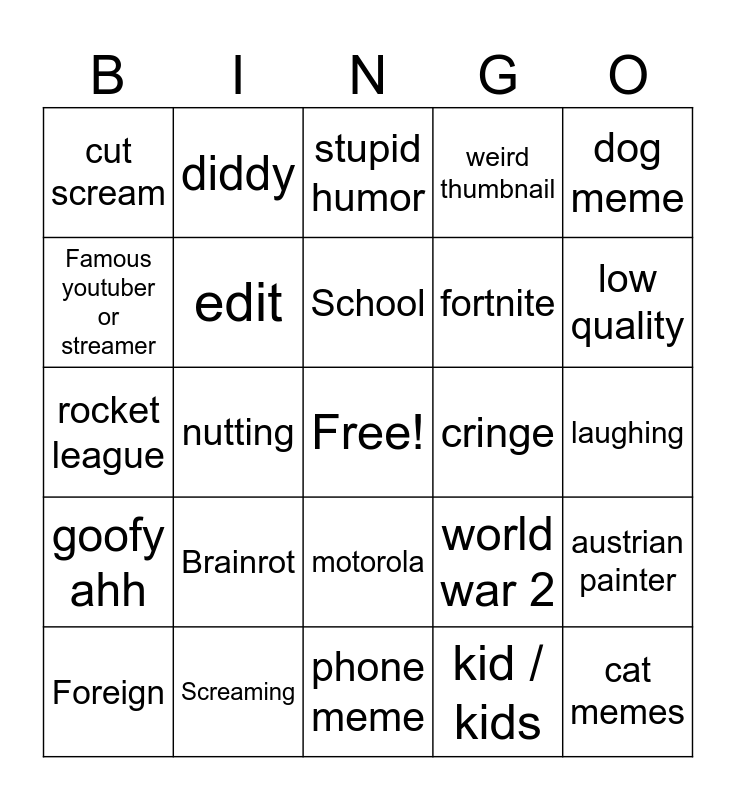 This bingo card has a free space and 24 words: Brainrot, Screaming, School, Foreign, dog meme, cut scream, Famous youtuber or streamer, diddy, cringe, motorola, fortnite, rocket league, world war 2, austrian painter, edit, kid / kids, laughing, stupid humor, low quality, nutting, cat memes, goofy ahh, weird thumbnail and phone meme.