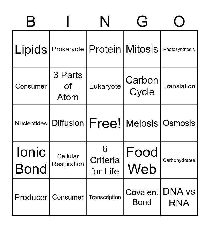 This bingo card has a free space and 24 words: Cellular Respiration, Consumer, Eukaryote, Producer, Photosynthesis, Lipids, Consumer, Prokaryote, Meiosis, 6 Criteria for Life, Carbon Cycle, Nucleotides, Food Web, Carbohydrates, 3 Parts of Atom, Covalent Bond, Osmosis, Protein, Translation, Diffusion, DNA vs RNA, Ionic Bond, Mitosis and Transcription.
