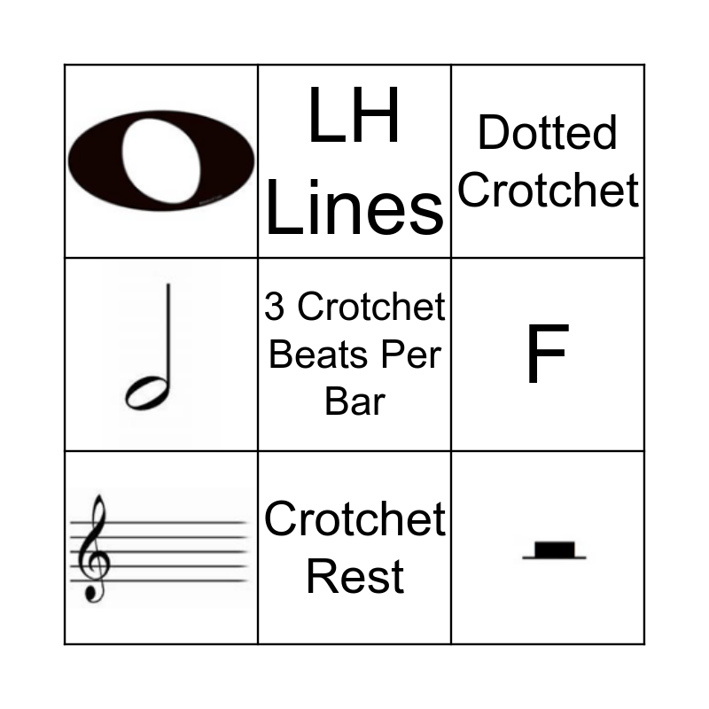 This bingo card has 4 images, a free space and 4 words: F, Dotted Crotchet, LH Lines and Crotchet Rest.