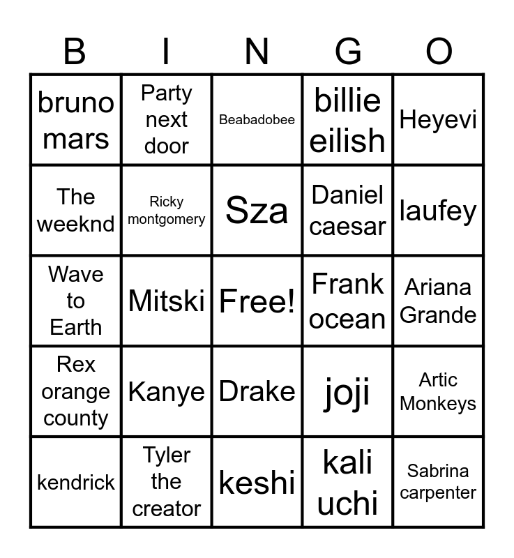 This bingo card has a free space and 24 words: Kanye, Tyler the creator, Sza, kendrick, Heyevi, bruno mars, The weeknd, Party next door, Frank ocean, Drake, Daniel caesar, Wave to Earth, joji, Artic Monkeys, Ricky montgomery, kali uchi, Ariana Grande, Beabadobee, laufey, Mitski, Sabrina carpenter, Rex orange county, billie eilish and keshi.