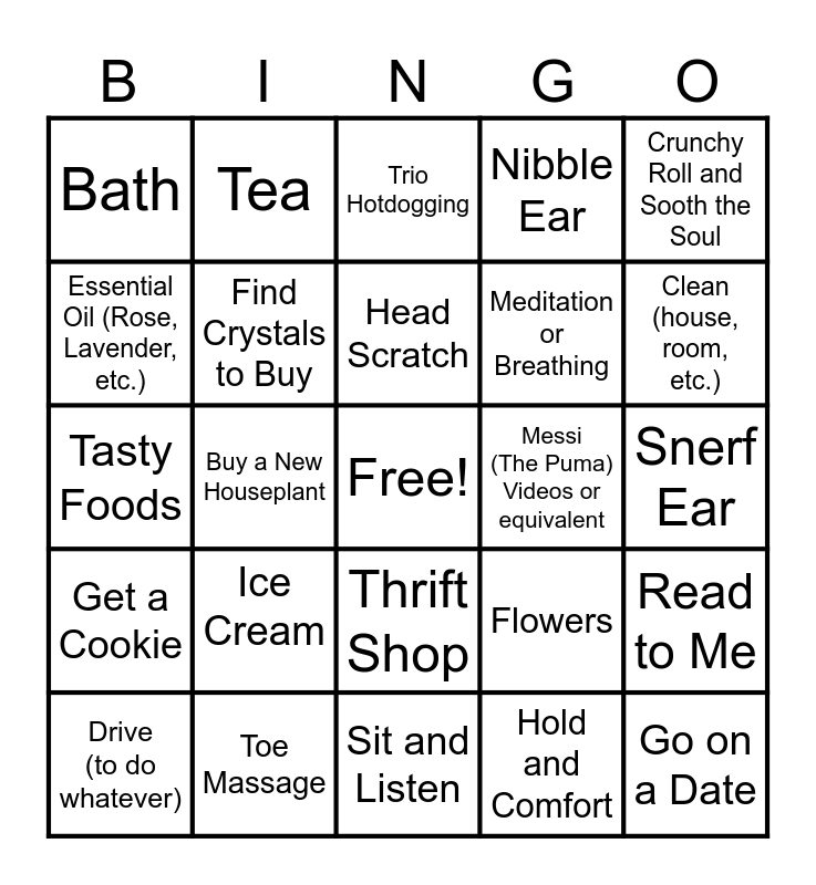 This bingo card has a free space and 24 words: Ice Cream, Toe Massage, Head Scratch, Drive (to do whatever), Crunchy Roll and Sooth the Soul, Bath, Essential Oil (Rose, Lavender, etc.), Tea, Messi (The Puma) Videos or equivalent, Thrift Shop, Meditation or Breathing, Tasty Foods, Flowers, Read to Me, Find Crystals to Buy, Hold and Comfort, Snerf Ear, Trio Hotdogging, Clean (house, room, etc.), Buy a New Houseplant, Go on a Date, Get a Cookie, Nibble Ear and Sit and Listen.