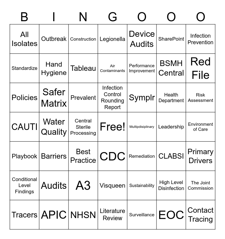 This bingo card has a free space and 69 words: Lippincott, Policies, C-Diff, CLABSI, CAUTI, SSI, Legionella, The Joint Commission, Device Audits, Accountability, Health Department, NHSN, All Isolates, Construction, Compliance, Performance Improvement, Infection Control Rounding Report, Hand Hygiene, Isolation, Safer Matrix, Red File, Symplr, Tableau, Leadership, Barriers, Visqueen, Audits, A3, Central Sterile Processing, High Level Disinfection, Outbreak, APIC, CIC, Bundle Compliance, Remediation, CDC, Literature Review, Playbook, SharePoint, Contact Tracing, Prevalent, BSMH Central, Environment of Care, HAI, MDRO, Risk Assessment, Primary Drivers, Surveillance, Patients, Infection Prevention, Standardize, Point of Use, Best Practice, Water Quality, IUSS, Demolition, Highest Risk Group, PCRA, Multipdisiplinary, Air Contaminants, Pathogens, Negative Pressure, Tracers, Conditional Level Findings, Sustainability, HHS, EOC, Locust of Control and Committee.