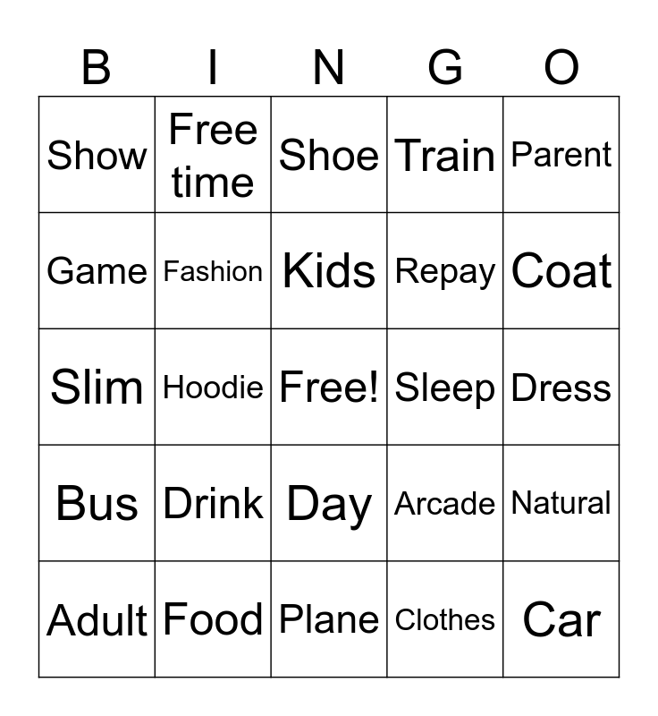 This bingo card has a free space and 24 words: Drink, Food, Kids, Adult, Parent, Show, Game, Free time, Sleep, Day, Repay, Slim, Arcade, Natural, Fashion, Clothes, Dress, Shoe, Coat, Hoodie, Car, Bus, Train and Plane.
