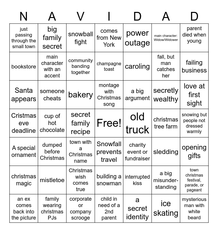 This bingo card has a free space and 48 words: interrupted kiss, fall, but man catches her, child in need of a 2nd parent, cup of hot chocolate, bakery, snowing but people not dressed warmly, big family secret, family wearing christmas PJs, main character: Widow/Widower, Snowfall prevents travel, parent died when young, comes from New York, secretly wealthy, a big argument, christmas magic, christmas tree farm, bookstore, failing business, a big misunder-standing, power outage, caroling, secret family recipe, just passing through the small town, main character with an accent, town christmas festival, parade, or pageant, community banding together, love at first sight, an ex comes back into the picture, montage with Christmas song, someone cheats, ice skating, old truck, opening gifts, mistletoe, Cristmas eve deadline, charity event or fundraiser, sledding, Santa appears, town with a Christmas name, Christmas wish comes true, A special ornament, mysterious man with white beard, snowball fight, corporate or company scrooge, champagne toast, building a snowman, dumped before Christmas and a secret identity.