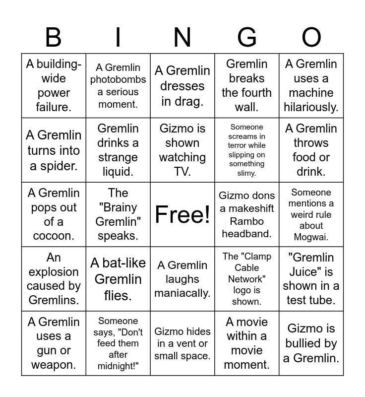 This bingo card has a free space and 40 words: Gizmo gets wet., A Gremlin pops out of a cocoon., Microwave or blender scene., Gremlin drinks a strange liquid., Someone says, "Don't feed them after midnight!", A Gremlin laughs maniacally., Gizmo is shown watching TV., A science lab experiment goes wrong., A Gremlin uses a machine hilariously., An explosion caused by Gremlins., The "Brainy Gremlin" speaks., Gremlin breaks the fourth wall., Gizmo is bullied by a Gremlin., Someone mentions a weird rule about Mogwai., Gizmo dons a makeshift Rambo headband., A bat-like Gremlin flies., A musical number featuring Gremlins., A building-wide power failure., Gremlins take over a corporate office., A Gremlin dresses in drag., "Gremlin Juice" is shown in a test tube., A movie within a movie moment., Someone screams in terror while slipping on something slimy., A Gremlin turns into a spider., Someone drinks coffee while chaos unfolds., A Gremlin sings or hums a tune., Gizmo runs in slow motion., A Gremlin turns into electricity., Someone shouts, "What is going on?!", A reference to a Looney Tunes cartoon., A TV host tries to stay professional during chaos., A Gremlin uses a gun or weapon., A security guard is overwhelmed by Gremlins., The "Clamp Cable Network" logo is shown., A Gremlin throws food or drink., Gizmo hides in a vent or small space., A parody of a horror or sci-fi movie., Someone says, "This is getting out of hand!", A Gremlin photobombs a serious moment. and The sprinkler system goes off and causes chaos..