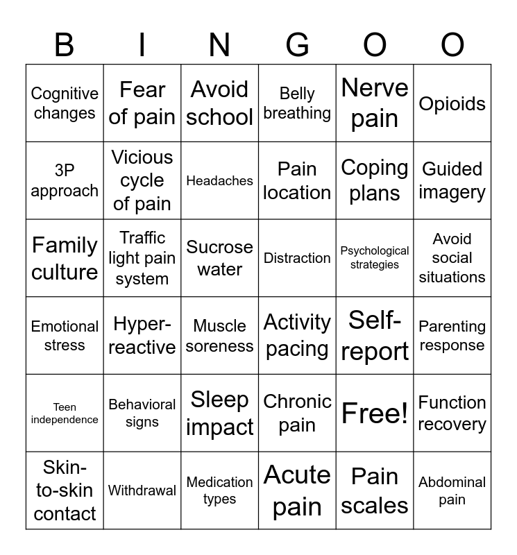 This bingo card has 37 words: Free!, Chronic pain, Pain scales, 3P approach, Hyper-reactive, Psychological strategies, Vicious cycle of pain, Acute pain, Nerve pain, Skin-to-skin contact, Guided imagery, Belly breathing, Family culture, Sucrose water, Opioids, Distraction, Behavioral signs, Avoid school, Avoid social situations, Traffic light pain system, Cognitive changes, Pain location, Muscle soreness, Self-report, Withdrawal, Parenting response, Fear of pain, Medication types, Function recovery, Sleep impact, Mood swings, Activity pacing, Coping plans, Teen independence, Emotional stress, Headaches and Abdominal pain.