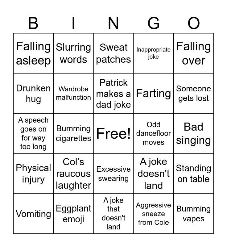 This bingo card has a free space and 24 words: Col’s raucous laughter, Eggplant emoji, Patrick makes a dad joke, Vomiting, Falling over, Falling asleep, Drunken hug, Slurring words, Odd dancefloor moves, Excessive swearing, Farting, A speech goes on for way too long, A joke doesn't land, Standing on table, Wardrobe malfunction, Aggressive sneeze from Cole, Bad singing, Sweat patches, Someone gets lost, Bumming cigarettes, Bumming vapes, Physical injury, Inappropriate joke and A joke that doesn't land.