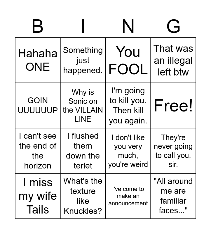 This bingo card has 17 words: I've come to make an announcement, I miss my wife Tails, You FOOL, Hahaha ONE, I flushed them down the terlet, That was an illegal left btw, They're never going to call you, sir., I'm going to kill you. Then kill you again., Free!, Why is Sonic on the VILLAIN LINE, What's the texture like Knuckles?, I don't like you very much, you're weird, GOIN UUUUUUP, Something just happened., I can't see the end of the horizon, That's right little girl I HATE YOU and "All around me are familiar faces...".