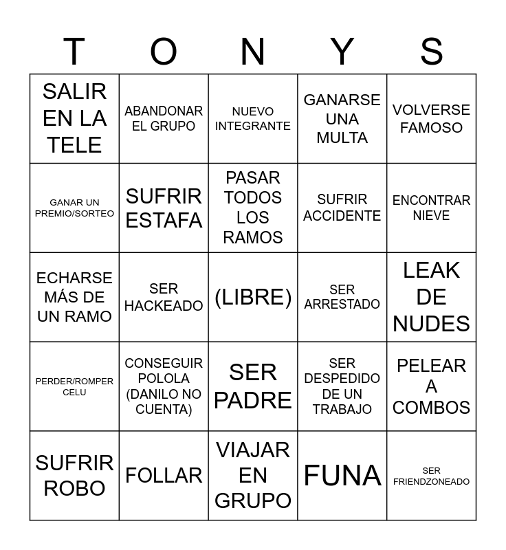 This bingo card has a free space and 24 words: CONSEGUIR POLOLA (DANILO NO CUENTA), FOLLAR, PASAR TODOS LOS RAMOS, SUFRIR ROBO, VOLVERSE FAMOSO, SALIR EN LA TELE, GANAR UN PREMIO/SORTEO, ABANDONAR EL GRUPO, SER ARRESTADO, SER PADRE, SUFRIR ACCIDENTE, ECHARSE MÁS DE UN RAMO, SER DESPEDIDO DE UN TRABAJO, PELEAR A COMBOS, SUFRIR ESTAFA, FUNA, LEAK DE NUDES, NUEVO INTEGRANTE, ENCONTRAR NIEVE, SER HACKEADO, SER FRIENDZONEADO, PERDER/ROMPER CELU, GANARSE UNA MULTA and VIAJAR EN GRUPO.
