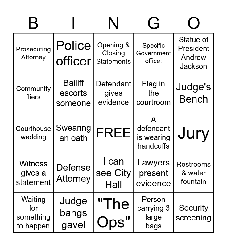 This bingo card has a free space and 24 words: Defense Attorney, Judge bangs gavel, Defendant gives evidence, Waiting for something to happen, Statue of President Andrew Jackson, Prosecuting Attorney, Community fliers, Police officer, A defendant is wearing handcuffs, I can see City Hall, Flag in the courtroom, Courthouse wedding, Lawyers present evidence, Restrooms & water fountain, Bailiff escorts someone, Person carrying 3 large bags, Jury, Opening & Closing Statements, Judge's Bench, Swearing an oath, Security screening, Witness gives a statement, Specific Government office: and "The Ops".