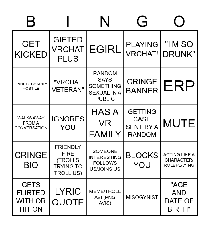 This bingo card has 78 words: POLY, DID, EGIRL, FURRY, STARTS A FIGHT, EBOY, WHITE KNIGHT, DRINKING, RANDOM CRYING, WOMAN SURROUNDED BY EBOYS, RANDOM IN THE WRONG, TARGETED BY MODS FOR DOING NOTHING, PLAYING VRCHAT!, GET KICKED, WHITE PERSON ACTING BLACK, UNNECESSARILY HOSTILE, CRASHER/. CRASHED, FRIENDLY FIRE (TROLLS TRYING TO TROLL US), PEDOPHILE, MUTE, CASHAPP IN BIO, "I'M SO DRUNK", WALKS AWAY FROM A CONVERSATION, RANDOM SAYS SOMETHING SEXUAL IN A PUBLIC, "VRCHAT VETERAN", PRESSED OVER SOMETHING SMALL(PRONOUNS, MISGENDERING ECT.), VRCHAT COUPLE, "THIS IS A PRIVATE CONVERSTATION" - IN A PUBLIC, SQUEAKER, RANDOM SHOWING OFF NSFW AVI, ERP, GUY IN A GIRL AVATAR, MEME/TROLL AVI (PNG AVIS), "AGE AND DATE OF BIRTH", GETS FLIRTED WITH OR HIT ON, GETTING CASH SENT BY A RANDOM, WINNING A POOL GAME AGAINST A RANDOM, STUTTERS, LISP/SPEACH IMPEDIMENT, HAS A VR FAMILY, OVER 30, VOICE CHANGER, EYE TRACKING, 700+ HOURS ON VRCHAT, MIRROR DWELLER, GIFTED VRCHAT PLUS, PHANTOM TOUCH, HEADPATS, UPDATING TEXT BOXES (MUSIC, DATE, TIME, GPU, CPU USAGES), KID<13, ACTING LIKE A CHARACTER/ ROLEPLAYING, IGNORES YOU, BLOCKS YOU, MUTES YOU, LOUD KIDS, NARCISSIST, DISCORD IN BIO, HIGH/ SMOKING WEED, IN A CALL (DISCORD, PHONE, ECT.), SOMEONE INTERESTING FOLLOWS US/JOINS US, CRINGE BANNER, FRIEND WHO ISNT PLAYING BINGO JOINS, FULLBODY, FEMBOY, TRANS, PC ONLY AVI OR QUEST ONLY AVI, VRCHAT CREATOR (WORLD OR AVIS), RANDOM SAYS "KILL YOUSELF", CRINGE BIO, LYRIC QUOTE, GUY SOUNDS LIKE A NERD, SOUNDBOARD, SLURS, VALVE INDEX, MISOGYNIST, READS OUT USERNAME, PLAYING MUSIC OVER MIC and DOWNBAD AVATARS.