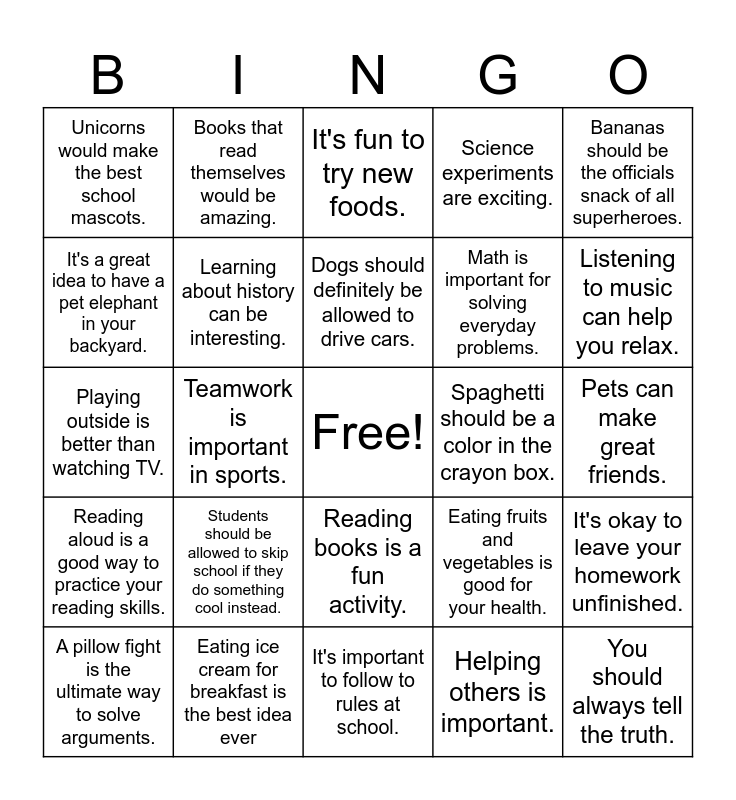 This bingo card has a free space and 24 words: Students should be allowed to skip school if they do something cool instead., Eating ice cream for breakfast is the best idea ever, Dogs should definitely be allowed to drive cars., A pillow fight is the ultimate way to solve arguments., Bananas should be the officials snack of all superheroes., Unicorns would make the best school mascots., It's a great idea to have a pet elephant in your backyard., Books that read themselves would be amazing., Spaghetti should be a color in the crayon box., Reading books is a fun activity., Math is important for solving everyday problems., Playing outside is better than watching TV., Eating fruits and vegetables is good for your health., It's okay to leave your homework unfinished., Learning about history can be interesting., Helping others is important., Pets can make great friends., It's fun to try new foods., Listening to music can help you relax., Teamwork is important in sports., You should always tell the truth., Reading aloud is a good way to practice your reading skills., Science experiments are exciting. and It's important to follow to rules at school..