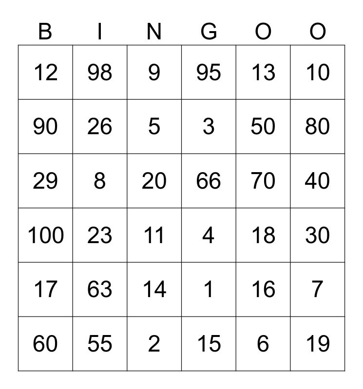 This bingo card has 36 words: 1, 14, 15, 90, 100, 66, 26, 2, 13, 16, 80, 95, 7, 8, 3, 12, 17, 70, 29, 9, 20, 23, 4, 11, 18, 98, 50, 55, 5, 10, 19, 60, 30, 40, 63 and 6.