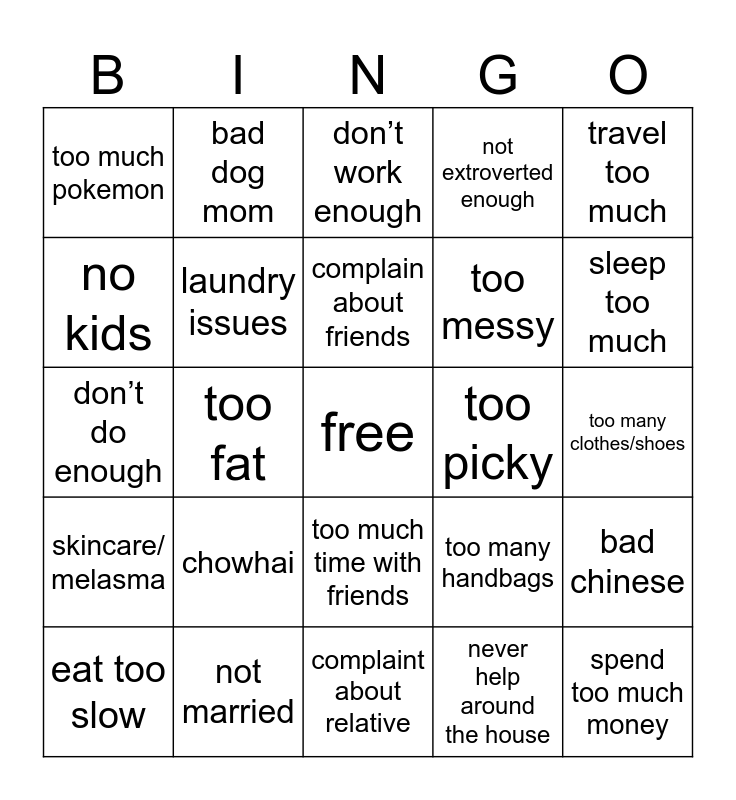 This bingo card has a free space and 24 words: chowhai, not married, complain about friends, eat too slow, travel too much, too much pokemon, no kids, bad dog mom, too picky, too much time with friends, too messy, don’t do enough, too many handbags, bad chinese, laundry issues, never help around the house, too many clothes/shoes, don’t work enough, sleep too much, too fat, spend too much money, skincare/ melasma, not extroverted enough and complaint about relative.